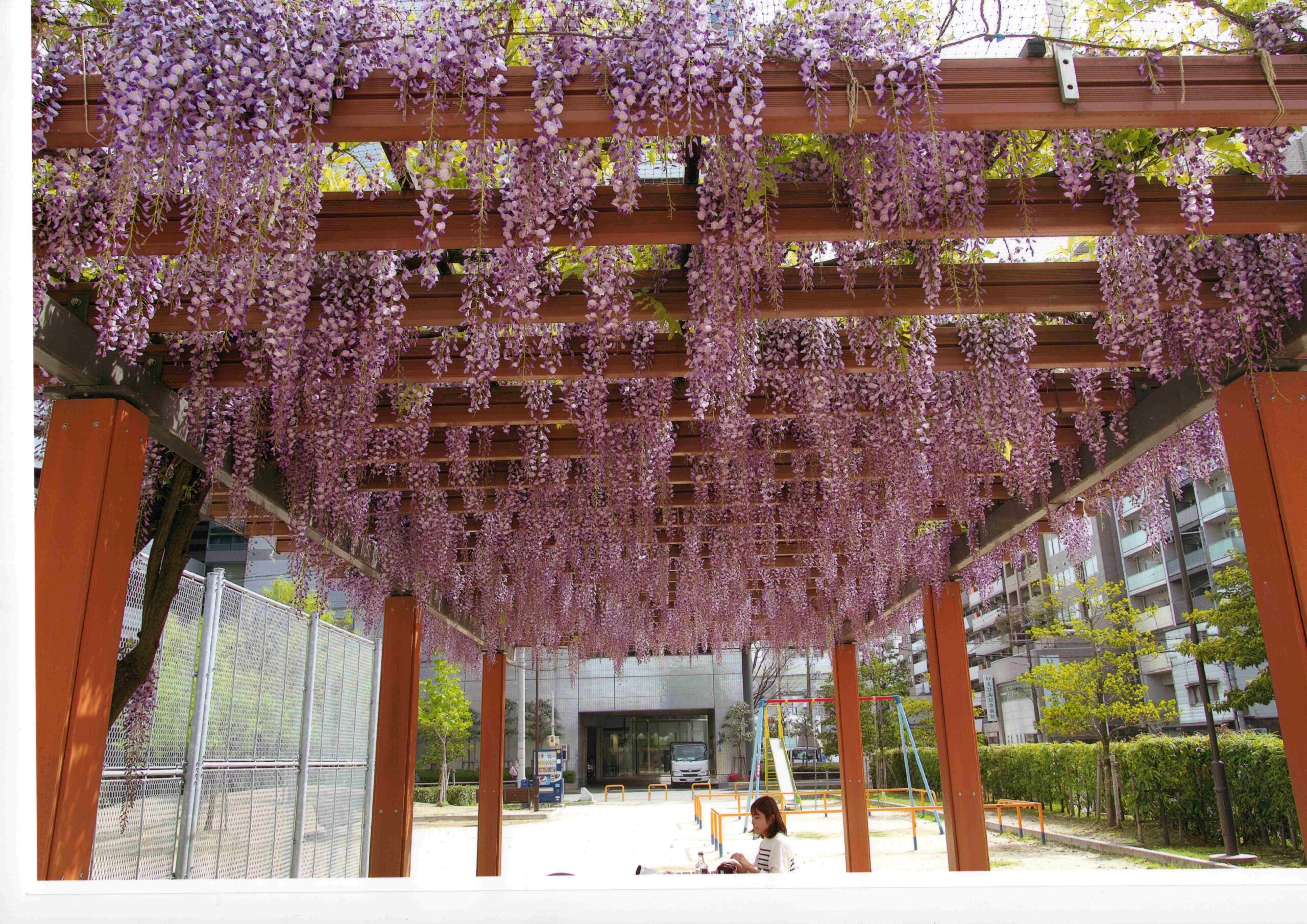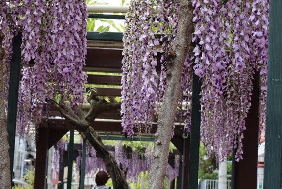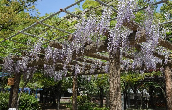 野田阪神駅北側の大型ショッピングモール”Wiste”はフジの英語名・Wisteriaに由来します。その北側に平成12年頃まで宝船冷蔵の冷蔵倉庫がありました。そこが平成27年(2015)に整備され開園しました。開園と同時に藤棚が設置されました。そこに、近隣の「のだふじの会」会員が”野田一才フジ”の苗木が植えたところ、日当たりがよく2~3年で棚一面に咲き始めました。静かな公園にたたずむ紫のフジが美しく福島区の代表的名所です。
