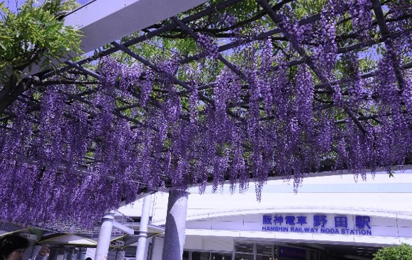 福島区の玄関口、阪神野田駅を降りると、目の前のロータリーに長さ約50mの藤棚があり、福島区の歴史的アイデンティティーを感じさせます。植えられているフジは、野田一才フジ(黒龍フジ)とアケボノフジです。フジの季節には沢山の人がここを訪れ写真を撮っています。「のだふじの会」が管理しており、毎年よく咲きます。