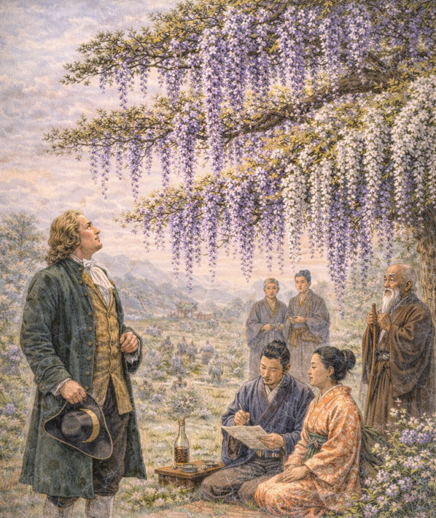 元禄年間、長崎・出島に滞在していたドイツ人医師・博物学者の エンゲルベルト・ケンペル は、オランダ商館長に随行し、将軍 徳川綱吉 に拝謁するため江戸へ向かう途上、摂津国野田村に咲く藤を目にしました。