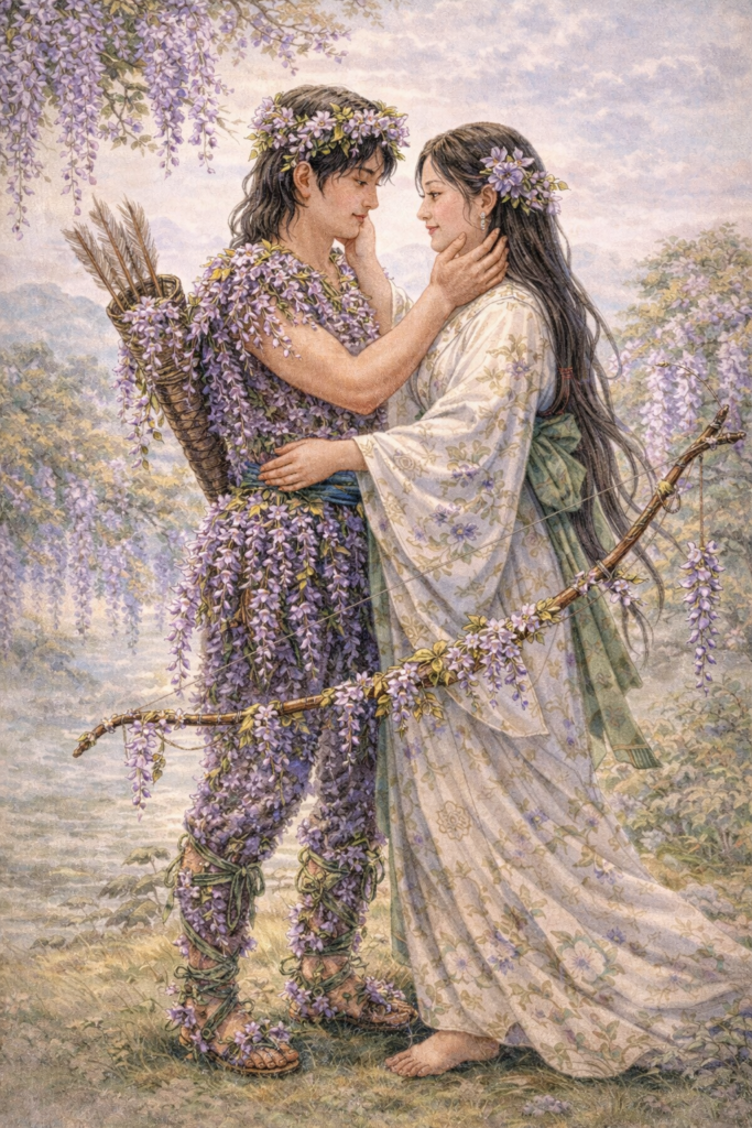フジが日本の記録に初めて登場するのは『古事記』応神天皇の条に見える、秋山の下火壮夫と春山の霞壮夫、そして出石乙女の婚姻説話です。美しい女神・出石乙女には多くの神々が求婚しましたが叶わず、兄神と弟神は乙女をめぐって賭けをしました。母は弟神のためにフジの蔓を用い、一夜で衣装や履物、弓矢を作り与えます。するとそれらはすべてフジの花となり、乙女の心を動かしました。弟神はその不思議な力に導かれて乙女と結ばれたと伝えられています。この物語は、フジが恋の成就を導く神秘的な力を持つ植物として認識されていたことを示しています。強靱な生命力と繊維の強さを備えていたため、古代の人々は花の美しさだけでなく、実用的な植物としての性質にも注目していました。