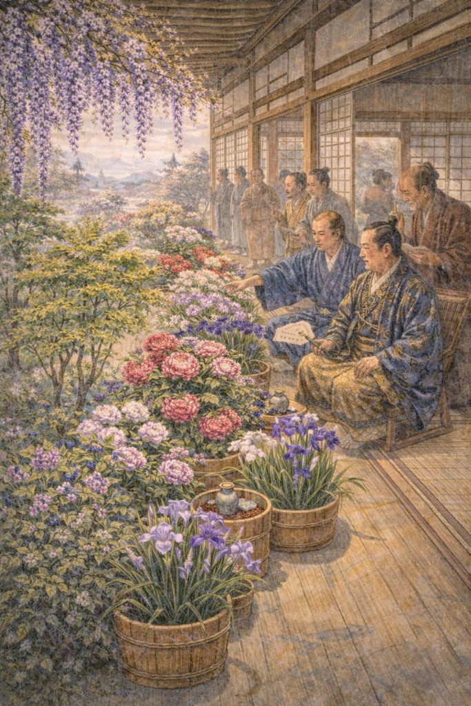 物語では、越後の豪商・竹六が上方での見栄比べとして華麗な花の競演「花軍」を催した様子が描かれています。卯月六日、新町の吉田屋喜兵衛の屋敷北側の長縁に花桶を並べ、当時知られた名花を集めて人々の目を楽しませました。