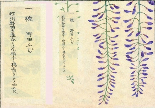 「摂津野田の藤は長さ四、五尺に至る。常の藤とは別なり、また花大にして短きものあり、また色ふじあり。」