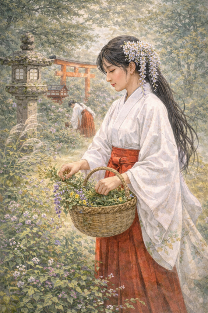 ここに詠まれる「御狩り」とは、鹿を追う狩猟ではなく、春の薬草を摘む行事のことです。いまも奈良の春日大社では春の神事としてその名残を見ることができます。巫女たちは簪に藤の花を挿し、神前に仕えますが、その姿は万葉の時代からほとんど変わっていないのかもしれません。