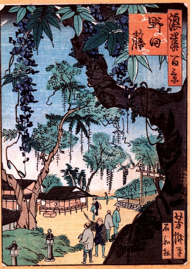 三代目・歌川広重が描いた浮世絵『東都三十六景 亀戸天神境内』の解説には、「江戸一番の藤の名所は亀戸天神境内であり、名所中の名所である。植えられた品種は、大坂から導入された花房の長い野田藤である」と記されています。